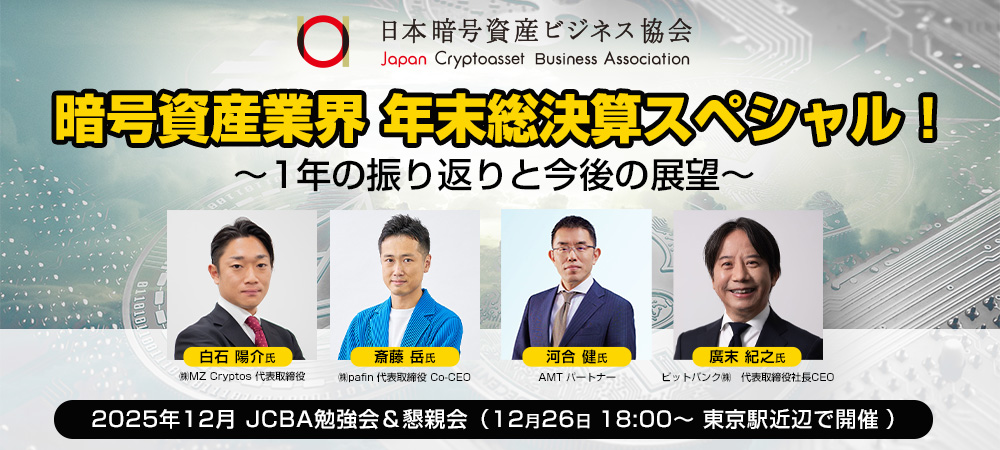 | タイムスケジュール | 18:00 : 開演(17:30 より受付開始) 18:00-18:10 : 協会活動総括 18:10-19:10 : パネルディスカッション 19:10-19:20 : 会場レイアウト変更 19:25-20:25 : 懇親会 20:25 : 閉会挨拶 ※内容、時間は予告なく変更なる場合がございましたので、ご了承ください。 ■ パネルディスカッション(18:10-19:10) ————————————– 暗号資産業界 年末総決算スペシャル! ~1年の振り返りと今後の展望~ ■パネリスト(予定) ・白石 陽介 株式会社MZ Cryptos 代表取締役(副会長) ・斎藤 岳 株式会社pafin(旧クリプタクト) 代表取締役(税制検討部会長) ・河合 健 アンダーソン・毛利・友常法律事務所外国法共同事業 パートナー 他 ■モデレーター ・廣末 紀之 ビットバンク株式会社 代表取締役社長CEO |