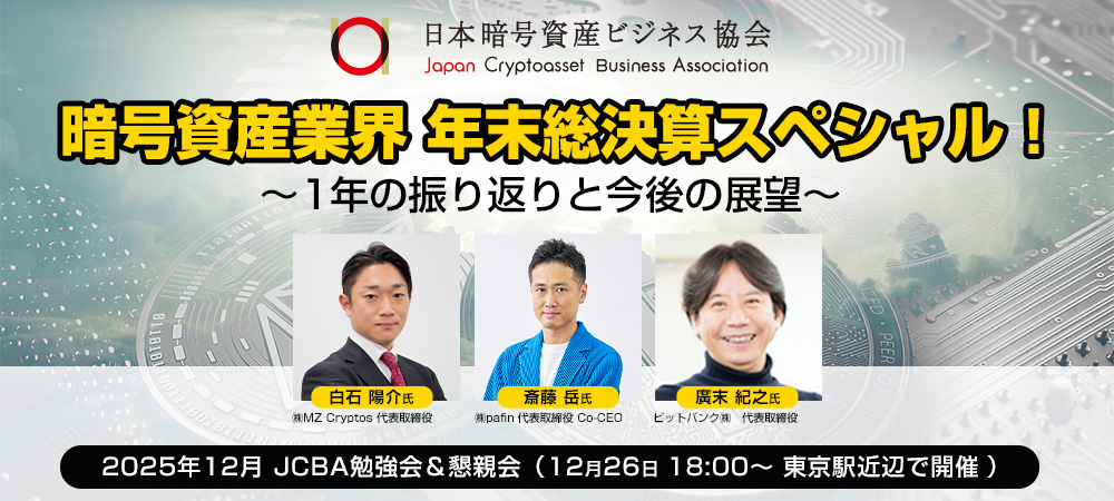 今年1年JCBAが取り組んできた活動を振り返り、今後の展望についてお話させていただきます。最新の金商法移行に関連する規制動向や、税制、国内ETF、JPCrypto-ISACなど、今年も激動の中にあった暗号資産業界の注目トピックを中心にパネルディスカッションを行います。