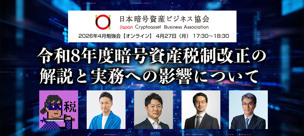 | タイムスケジュール | ●17:30 冒頭挨拶 「令和8年度税制改正に関するJCBAの取組みと成果について」 ・斎藤 岳氏(株式会社pafin 代表取締役、税制検討部会長) ●17:35 講演 「令和8年度暗号資産税制改正の解説」 ■講師 ・泉 絢也氏(税理士・東洋大学法学部教授、税制検討部会顧問) ●18:05 パネルディスカッション&質疑応答 昨年12月、令和8年度税制改正大綱が閣議決定され、本年3月に所得税法等の一部を改正する法律が成立、及び関連する政省令等が公布され、令和8年度税制改正内容の詳細が公表された。本勉強会では、令和8年度暗号資産税制改正の解説と共に、今後の税制に関する課題や論点について実務面も踏まえて議論を実施する。 ■パネリスト ・遠藤 努氏(長島・大野・常松法律事務所パートナー、税制検討部会顧問) ・下尾 裕氏(アンダーソン・毛利・友常法律事務所パートナー、税制検討部会顧問) ・泉 絢也氏(税理士・東洋大学法学部教授、税制検討部会顧問) ■モデレーター ・竹ケ原 圭吾氏(コインチェック株式会社 常務執行役員CFO 経営戦略本部長) ●18:30 終了 |