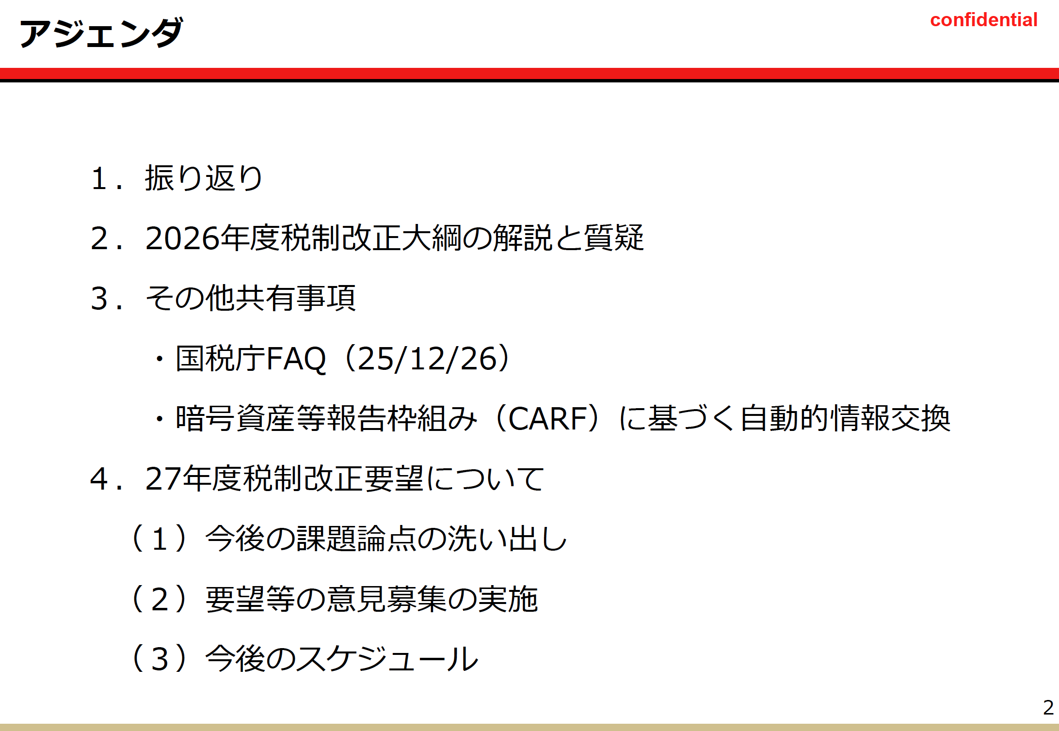 HOME提言・報告書税制検討部会【第21回】部会活動 (2026年1月22日) 提言・報告書一覧 2026.01.22 税制検討部会 # 部会活動 【第21回】部会活動 (2026年1月22日) 2025年度活動の振り返りと、2026年度に向けた課題論点や要望事項について 2025年度の活動の振り返りでは、税制改正要望の内容と26年度税制改正大綱の解説、国税庁FAQやCARFについて共有が行われた。 2026年度に向けては、今後の課題論点や要望項目の洗い出しについて議論、同時に意見募集を開始した。 会場:オンライン開催 税制検討部会の詳細を確認