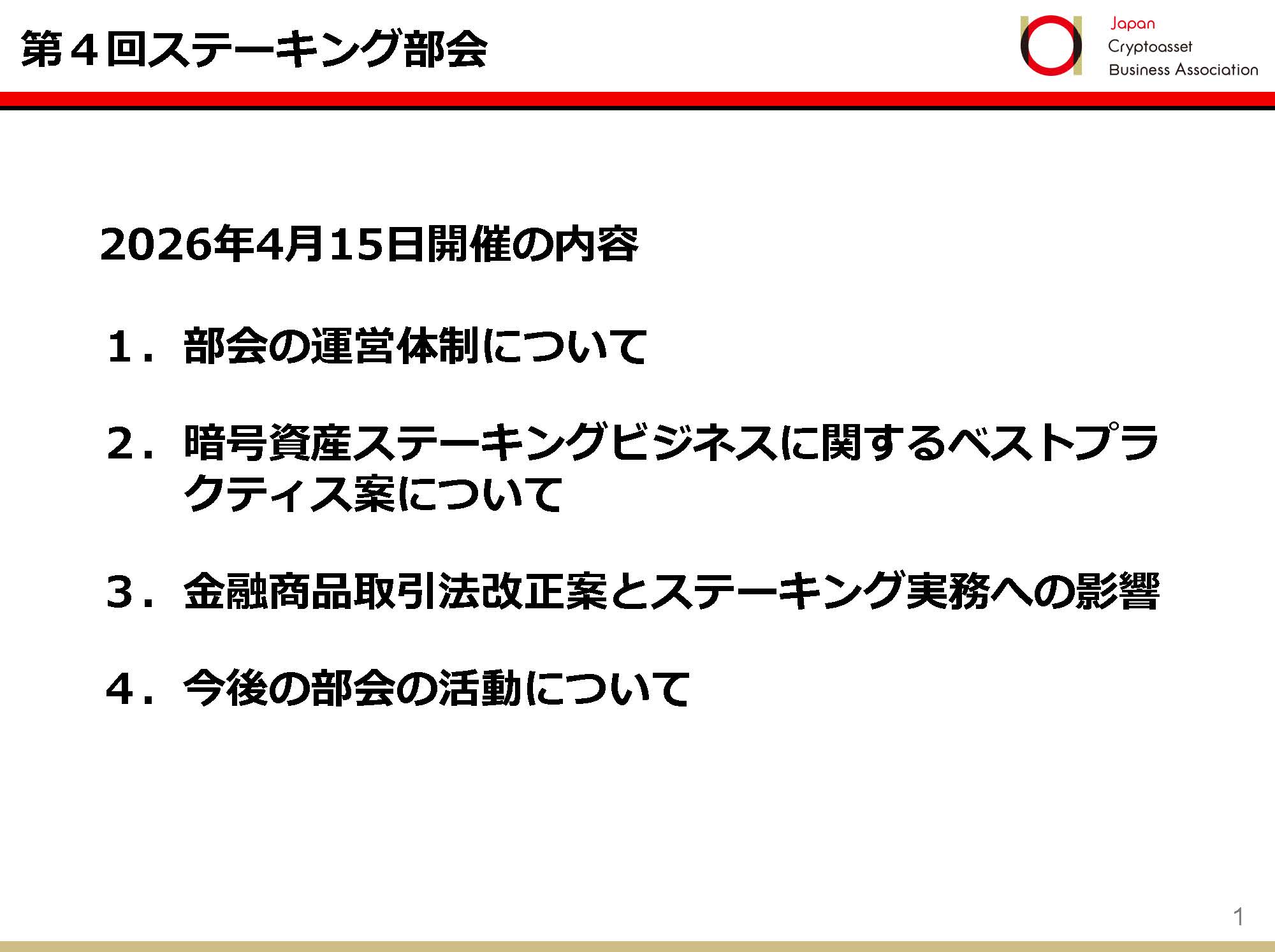 第4回では、部会の成果として「暗号資産ステーキングビジネスに関するベストプラクティス」の説明と意見交換を実施、近く公開を行う予定です。さらに先週末に公表されたばかりの金融商品取引法改正案に関する解説とステーキング実務への影響について議論を行いました。